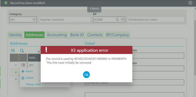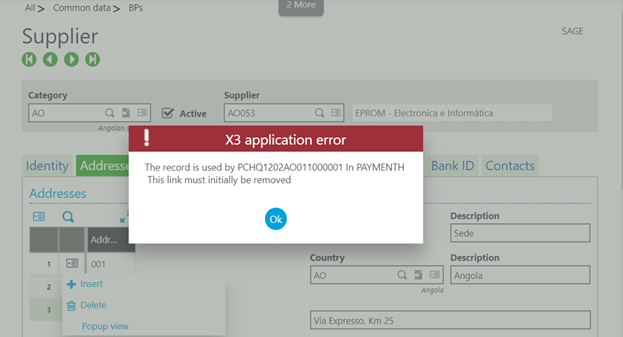 Now go to Addresses tab, click on line level action button and click on delete the below message will popup, which means that this address is used on the BP record.