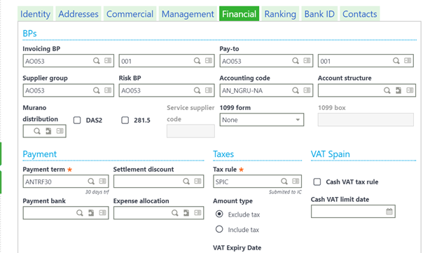 Next go to the Financials tab and change the address in the 2 blocks next to Invoicing BP and Pay-to as shown below and click on Save, to save the changes.