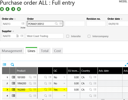 You can see the process starts at the purchase order line level based on the various settings and parameters, the QC flag being set to Yes.
