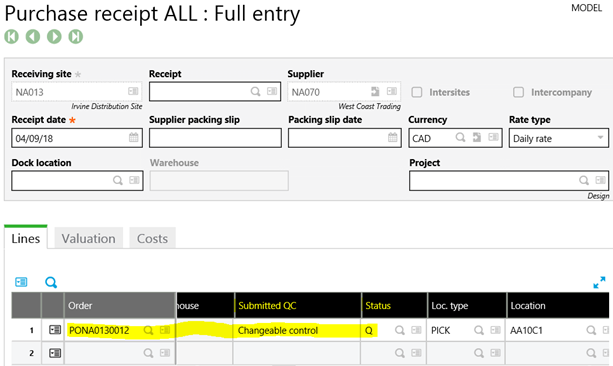 As the purchase order receipts are being processed, the product status code is being set to Q. Again, based on the stock management rules certain transactions cannot be performed with Q status products.