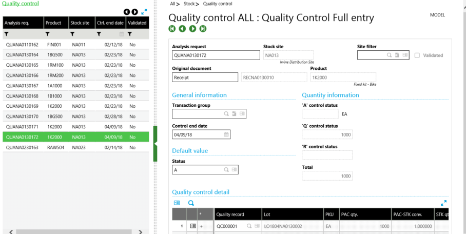 There are various setups on the product, product-site, technical sheets and stock management rules that define exactly when and how the quality control process will function within Sage Enterprise.