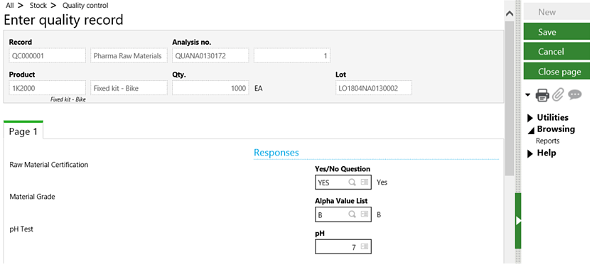 The enter quality record screen will appear. The top section of the screen being the analysis request detail and the lower part of the screen being comprised of the questions and responses defined on the technical sheet.