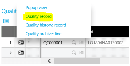 Clicking the action button on the detail line of the quality control grid and then click the Quality record options will give you access to the technical sheet.